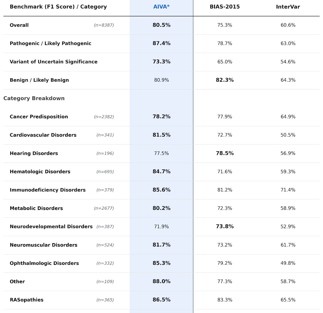 TL;DR: Rule-based variant classifiers hit a ceiling because they ignore context. AIVA incorporates phenotype, inheritance, and functional evidence into every classification. On FDA-approved eRepo data, this achieves an overall F1 of 80.5%—outperforming InterVar (60.6%) and BIAS-2015 (75.3%) across 11 disease categories.