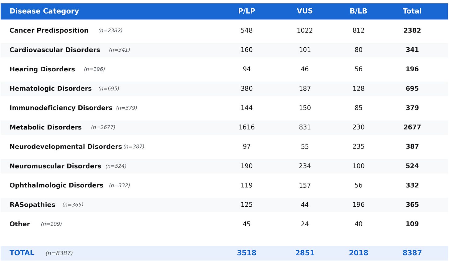 We also evaluated AIVA's performance by disease category. It outperforms other classifiers in 9 of 11 categories (see Figure 2). The largest gains appear in hematologic disorders, immunodeficiencies, ophthalmologic conditions, and RASopathies; areas that are relatively well studied, with richer gene–phenotype associations and more structured clinical knowledge. In these domains, incorporating context enables AIVA to leverage information present in the literature and clinical records that is difficult to encode as fixed rules. On the other hand, for neurodevelopmental disorders, AIVA disagreed with historical benign classifications in several cases, flagging them for review based on recent literature. We saw this pattern across other categories too i.e variants historically curated as B/LB reclassified to VUS or P/LP when AIVA recognized literature consistent with the disease mechanism. Whether this reflects over-caution or appropriate updating is worth examining.