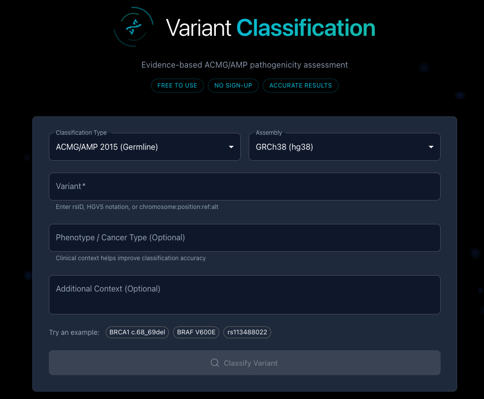 AIVA (our AI clinical analyst agent) was built around that distinction of phenotype-aware classification. Our agent reasons over the evidence in context, integrating phenotype, inheritance, and disease expectations when available. In AIVA, users can explicitly specify phenotype, inheritance, and family history, allowing classifications to be evaluated in a clinical context rather than in isolation.